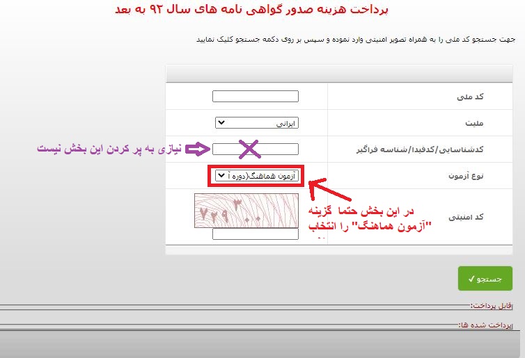 برای دریافت گواهی نامه فنی و حرفه ای در هر رشته ای که آزمون داده اید باید ابتدا از طریق دکمه ی “پرداخت هزینه گواهینامه“، مبلغ را بپردازید: